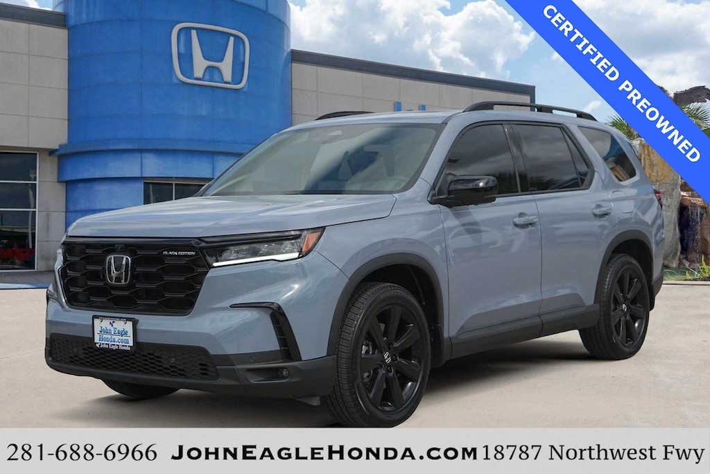 Certified. LOCAL TRADE, BLUETOOTH, CLEAN CARFAX, NON-SMOKER, CERTIFIED, CARFAX ONE OWNER, Remainder of Factory Warranty Still Applies!, ** LEATHER SEATS, ** SUNROOF, ** 3RD-ROW SEATS, ** HEATED SEATS, ** REARVIEW CAMERA, ** NAVIGATION SYSTEM, ** KEYLESS ENTRY, ** REMOTE ENGINE START, ** BLUETOOTH, HANDS-FREE, ** BLIND SPOT ALERT, ** KEYLESS START, ** PREMIUM WHEELS, ** PREMIUM SOUND SYSTEM, ** ROOF RACK, ** ANDROID AUTO, ** LANE DEPARTURE WARNING, ** SATELLITE RADIO, ** STEERING WHEEL CONTROLS, ** ALARM SYSTEM, ** WIFI HOTSPOT, ** AUXILIARY AUDIO INPUT, ** LOCAL TRADE-IN, ** LOCALLY OWNED AND SERVICED, ** ALL WHEEL DRIVE, ** ADVANCED SAFETY TECHNOLOGY, ** BACK UP CAMERA, ** POWER TAILGATE, ** ALLOY WHEELS, Pilot Black Edition, HondaTrue Certified Certified, 4D Sport Utility, 3.5L V6 DOHC 24V, 10-Speed Automatic, AWD, Sonic Gray Pearl, Blk/Black Leather, 12 Speakers, 3rd row seats: split-bench, 4-Wheel Disc Brakes, 4.167 Axle Ratio, ABS brakes, Adaptive Cruise Control: Adaptive Cruise Control (ACC) with Low-Speed Follow, Air Conditioning, Alloy wheels, AM/FM radio: SiriusXM, Apple CarPlay/Android Auto, Auto High-beam Headlights, Auto-dimming door mirrors, Auto-dimming Rear-View mirror, Automatic temperature control, Blind Spot Information (BSI) System warning, Bose Premium Sound System, Brake assist, Bumpers: body-color, Compass, Delay-off headlights, Driver door bin, Driver vanity mirror, Dual front impact airbags, Dual front side impact airbags, Electronic Stability Control, Emergency communication system: HondaLink, Exterior Parking Camera Rear, Four wheel independent suspension, Front anti-roll bar, Front Bucket Seats, Front Center Armrest, Front dual zone A/C, Front fog lights, Front reading lights, Fully automatic headlights, Garage door transmitter: HomeLink, Heads-Up Display, Heated and Ventilated Front Bucket Seats, Heated door mirrors, Heated front seats, Heated rear seats, Heated steering wheel, Honda Satellite-Linked Navigation System, HondaLink Subscription Services, Illuminated entry, Knee airbag, Lane departure: Lane Keeping Assist System (LKAS) active, Low tire pressure warning, Memory seat, Navigation system: Honda Satellite-Linked Navigation System, Occupant sensing airbag, Outside temperature display, Overhead airbag, Overhead console, Panic alarm, Passenger door bin, Passenger vanity mirror, Perforated Leather Seat Trim, Power door mirrors, Power driver seat, Power Liftgate, Power moonroof, Power passenger seat, Power steering, Power windows, Radio data system, Rain sensing wipers, Rear air conditioning, Rear anti-roll bar, Rear reading lights, Rear seat center armrest, Rear window defroster, Rear window wiper, Reclining 3rd row seat, Remote keyless entry, Security system, SiriusXM, Speed control, Speed-sensing steering, Speed-Sensitive Wipers, Split folding rear seat, Spoiler, Steering wheel mounted audio controls, Tachometer, Telescoping steering wheel, Tilt steering wheel, Traction control, Trip computer, Turn signal indicator mirrors, Variably intermittent wipers, Ventilated front seats, Wheels: 20 Gloss Black with Black Lug Nuts, Pilot Black Edition, 4D Sport Utility, 3.5L V6 DOHC 24V, 10-Speed Automatic, AWD, Sonic Gray Pearl, Blk/Black Leather.