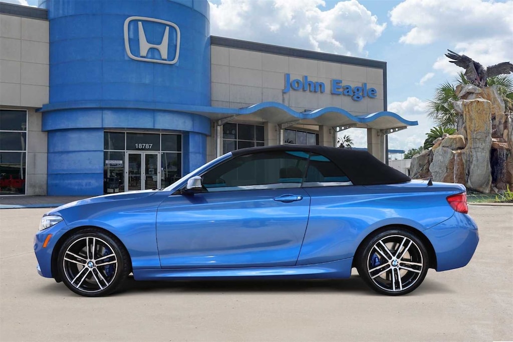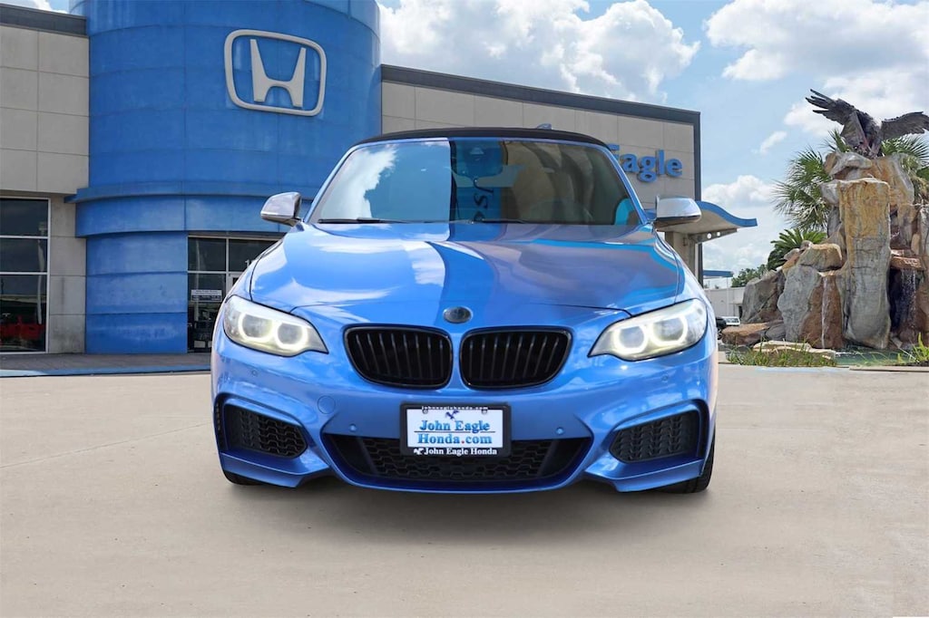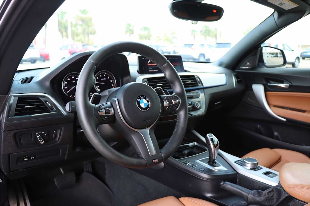 LOCAL TRADE, BLUETOOTH, NON-SMOKER, Remainder of Factory Warranty Still Applies!, ** LEATHER SEATS, ** HEATED SEATS, ** REARVIEW CAMERA, ** NAVIGATION SYSTEM, ** KEYLESS ENTRY, ** BLUETOOTH, HANDS-FREE, ** BLIND SPOT ALERT, ** KEYLESS START, ** PREMIUM WHEELS, ** PREMIUM SOUND SYSTEM, ** ANDROID AUTO, ** LANE DEPARTURE WARNING, ** SATELLITE RADIO, ** STEERING WHEEL CONTROLS, ** ALARM SYSTEM, ** WIFI HOTSPOT, ** AUXILIARY AUDIO INPUT, ** LOCAL TRADE-IN, ** LOCALLY OWNED AND SERVICED, 2 Series M240i, 2D Convertible, I6, 8-Speed Automatic Sport, RWD, Estoril Blue Metallic, Cognac/Dark Brown Cognac Lthr W/Dark Brown Hglgt, 4-Wheel Disc Brakes, 6 Speakers, ABS brakes, Adaptive suspension, Advanced Real-Time Traffic Information, Air Conditioning, Alloy wheels, AM/FM radio: SiriusXM, Apple CarPlay Compatibility, Auto-dimming door mirrors, Auto-dimming Rear-View mirror, Automatic temperature control, Brake assist, Bumpers: body-color, Convertible roof lining, Convertible roof wind blocker, Delay-off headlights, Driver door bin, Driver vanity mirror, Dual front impact airbags, Dual front side impact airbags, Electronic Stability Control, Emergency communication system: BMW Assist eCall, Exterior Parking Camera Rear, Four wheel independent suspension, Front anti-roll bar, Front Bucket Seats, Front Center Armrest, Front dual zone A/C, Front reading lights, Front Sport Seats, Fully automatic headlights, Glass rear window, Hands-Free Bluetooth & USB Audio Connection, harman/kardonî Logic 7î Digital Surround, Heated door mirrors, Heated Front Seats, Heated Steering Wheel, Hi-Fi Sound System, Illuminated entry, Increased Top Speed Limiter, Integrated roll-over protection, Knee airbag, Leather Shift Knob, Low tire pressure warning, Lumbar Support, Memory seat, Navigation System, Occupant sensing airbag, Outside temperature display, Panic alarm, Passenger door bin, Passenger vanity mirror, Power convertible roof, Power door mirrors, Power driver seat, Power Front Seats, Power passenger seat, Power steering, Power windows, Premium Package, Radio data system, Radio: AM/FM Audio System, Rain sensing wipers, Rear anti-roll bar, Rear window defroster, Remote keyless entry, Remote Services, Security system, SensaTec Upholstery, SiriusXM Satellite Radio, Speed control, Speed Limit Info, Speed-sensing steering, Speed-Sensitive Wipers, Sport steering wheel, Steering wheel mounted audio controls, Tachometer, Telescoping steering wheel, Tilt steering wheel, Traction control, Trip computer, Turn signal indicator mirrors, Universal Garage-Door Opener, Variably intermittent wipers, Wheels: 18 x 7.5 Fr & 18 x 8 Rr (Style 719M), 2 Series M240i, 2D Convertible, I6, 8-Speed Automatic Sport, RWD, Estoril Blue Metallic, Cognac/Dark Brown Cognac Lthr W/Dark Brown Hglgt, 4-Wheel Disc Brakes, 6 Speakers, ABS brakes, Adaptive suspension, Advanced Real-Time Traffic Information, Air Conditioning, Alloy wheels, AM/FM radio: SiriusXM, Apple CarPlay Compatibility, Auto-dimming door mirrors, Auto-dimming Rear-View mirror, Automatic temperature control, Brake assist, Bumpers: body-color, Convertible roof lining, Convertible roof wind blocker, Delay-off headlights, Driver door bin, Driver vanity mirror, Dual front impact airbags, Dual front side impact airbags, Electronic Stability Control, Emergency communication system: BMW Assist eCall, Exterior Parking Camera Rear, Four wheel independent suspension, Front anti-roll bar, Front Bucket Seats, Front Center Armrest, Front dual zone A/C, Front reading lights, Front Sport Seats, Fully automatic headlights, Glass rear window, Hands-Free Bluetooth & USB Audio Connection, harman/kardonî Logic 7î Digital Surround, Heated door mirrors, Heated Front Seats, Heated Steering Wheel, Hi-Fi Sound System, Illuminated entry, Increased Top Speed Limiter, Integrated roll-over protection, Knee airbag, Leather Shift Knob, Low tire pressure warning, Lumbar Support, Memory seat, Navigation System, Occupant sensing airbag, Outside temperatu